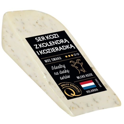 Słony, ale zarazem i delikatny smak sera koziego został urozmaicony o dodatek kolendry i kozieradki, które wpływają na jego charakter. Suszone zioła sprawiają, że nabiera on wyrazistości i niesamowitego aromatu. Będzie doskonałym urozmaiceniem kanapek oraz ciekawym elementem zup i sosów. Sam idealnie smakuje z białym wytrawnym winem.