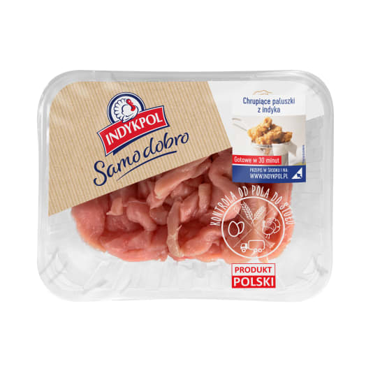 Wykonane z delikatnego i zdrowego mięsa z fileta z indyka, pocięte na kawałki o kształcie nieregularnych pasków, o wielkości ok. 1cm x 6cm x 1cm