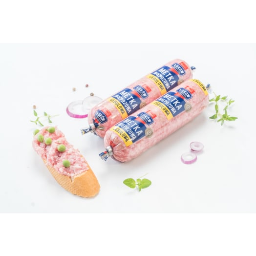 Metka cebulowa to surowy produkt skomponowany z mięsa wieprzowego i wołowego. To prawdziwa gradka dla smakoszy – w połączeniu ze świeżym pieczywem i ogórkiem konserwowym smakuje wprost wybornie!