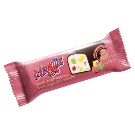 Baton twarogowy z galaretką Magija oblany czekoladową polewą ucieszy każde dziecko i niejednego dorosłego. Ta przekąska łączy w sobie smak sernika, słodycz owoców i goryczkę czekolady, dając wyborny efekt. Batoniki serowe są dobrym źródłem wapnia i białka.