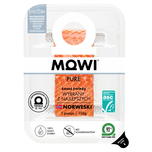 Łosoś świeży ze skórą Mowi to surowa ryba pochodząca z Norwegii. Przyrządzisz ją na kilka sposobów – łososia atlantyckiego można smażyć, piec, gotować na parze, można go też dodać do makaronu z kremowym sosem. Produkt ma certyfikat odpowiedzialnej hodowli, przyznawany tym, którzy dbają o ryby i o środowisko.