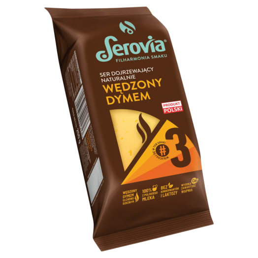 Ser żółty wędzony w kawałku marki Serovia jest produkowany z polskiego mleka i naturalnie wędzony dymem olchowo-bukowym. Jest bogaty w wapń, nie zawiera laktozy ani konserwantów. Można go kroić w plastry na kanapkę, można go zetrzeć do makaronu, a pokrojony w kostkę świetnie się zaprezentuje na desce serów.