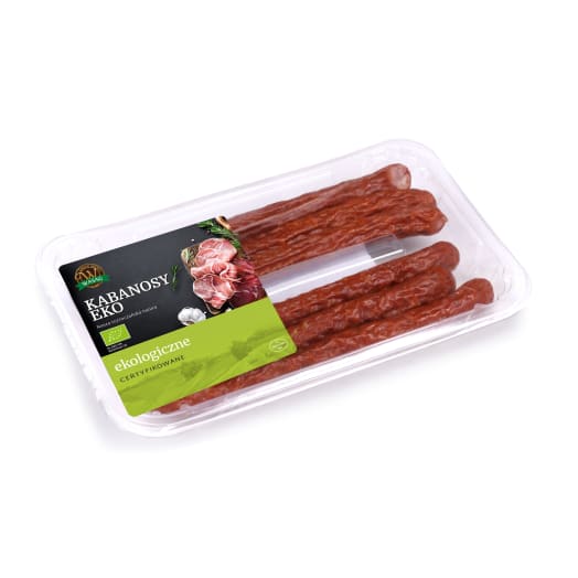 Starannie suszone i wędzone kabanosy WASĄG BIO, przyrządzane z peklowanego mięsa wieprzowego. Mają idealnie suchą i równomiernie pomarszczoną powierzchnię. Z wierzchu są ciemnoczerwone z odcieniem wiśniowym.